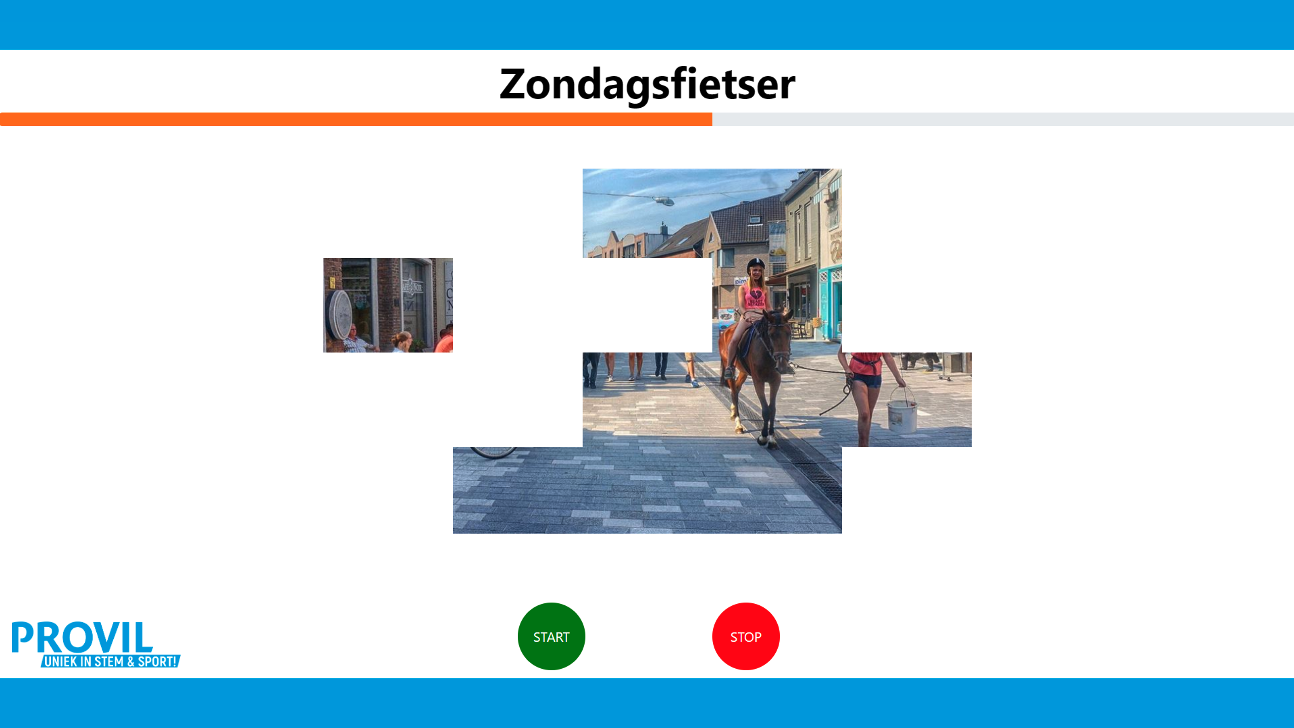Voor de visualisatie van de beweging van de fiets hebben we zelf een game ontworpen. In de deze game word met de trapbeweging een foto steeds meer zichtbaar. Wij hebben hier gekozen voor 2 effecten, een puzzeleffect en een vervagingseffect. We hebben hier ook nog een “progress-bar” in gestoken om het extra visueel te maken. Het menu van de game zelf bestaat uit 3 pagina’s: een loginpagina, een effectenpagina en een moeilijkheidspagina.